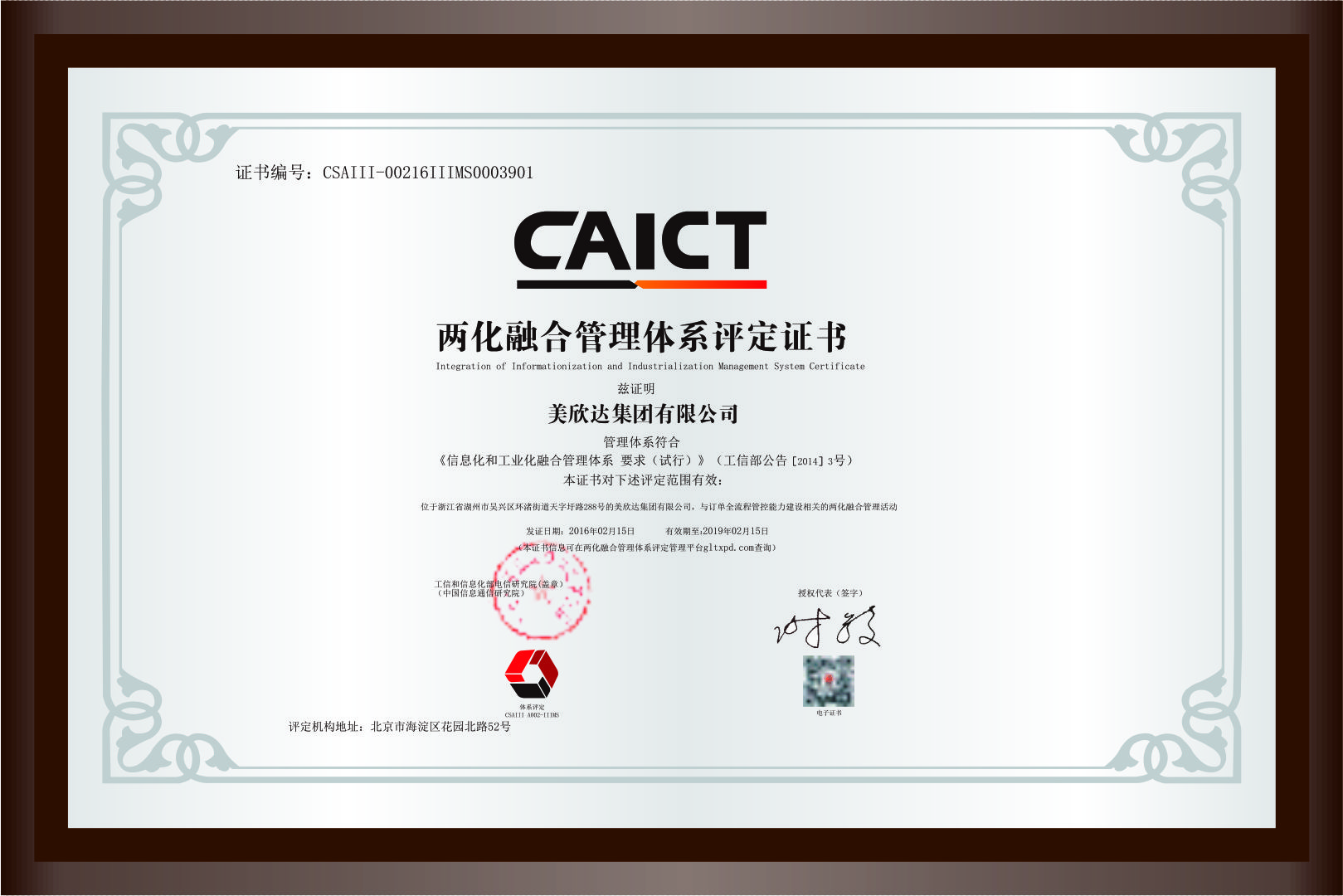 兩化融合管理體系評定證書