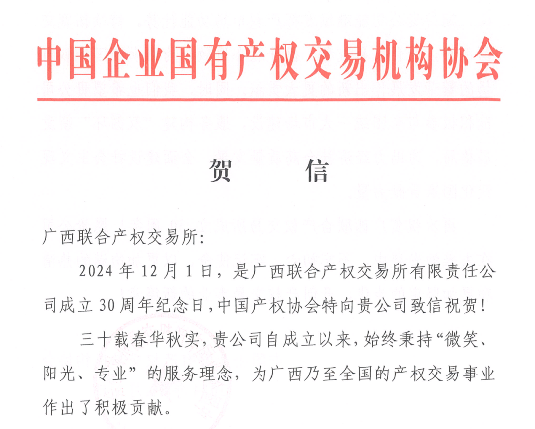 中國企業(yè)國有產(chǎn)權(quán)交易機構(gòu)協(xié)會致信祝賀廣西聯(lián)合產(chǎn)權(quán)交易所成立30周年